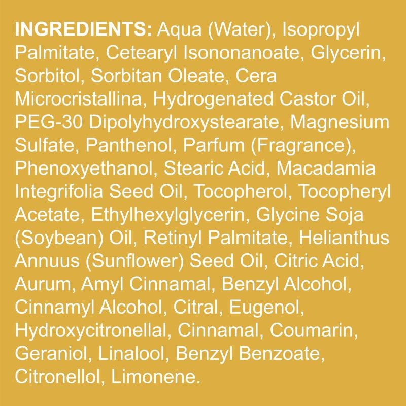 Key Ingredients: beeswax, macadamia nut extract, lecithin, retinyl palmitate (Vitamin A), gold and citrus.