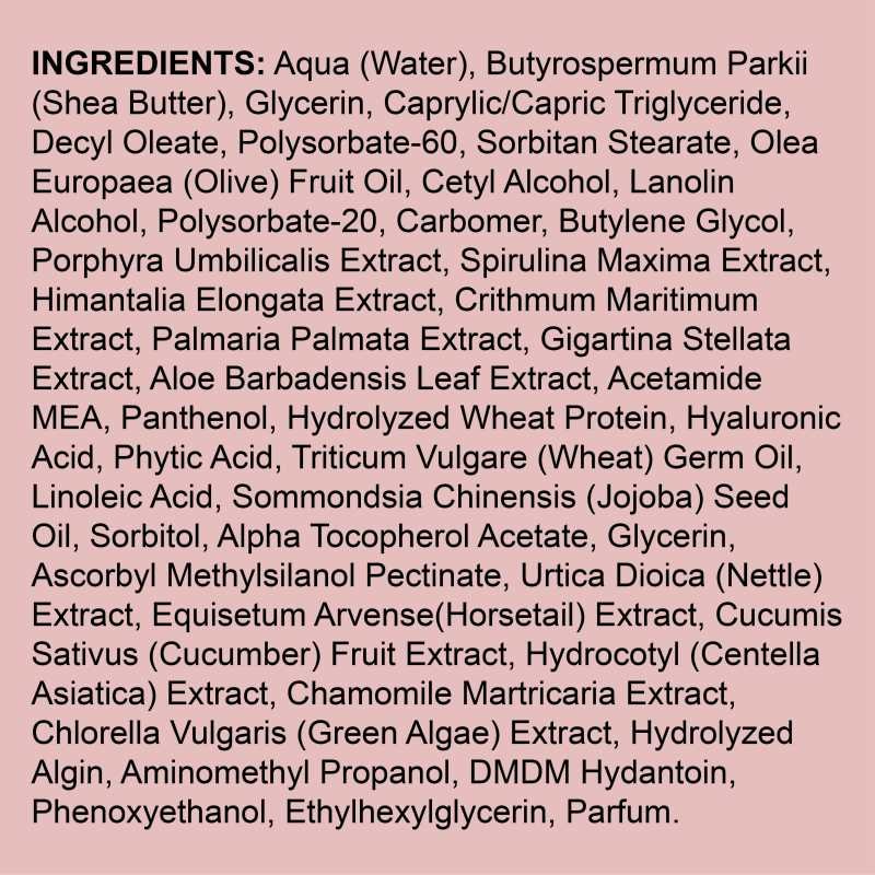 | Key Ingredients | Algae, Aloe Extract, Cucumber, Glycerin, Horsetail, Hyaluronic Acid, Hydrolyzed Wheat, Jojoba Seed Oil, Nettle, Olive Oil, Panthenol, Shea Butter, Wheat Germ |