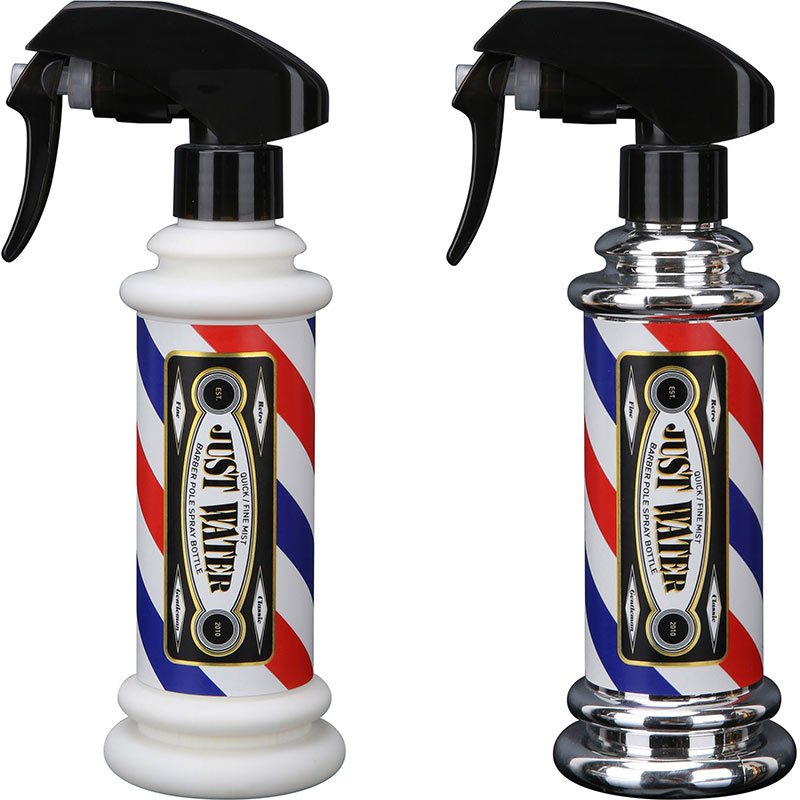 Fine mist spray bottle for water. This multi-position, barber pole-themed spray bottle is comfortable in the hand and sprays a fine mist to dampen hair or facial hair. Can be sprayed upside down.