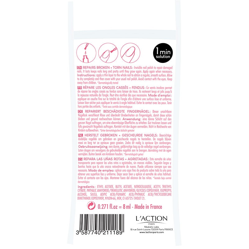 An invisible nail polish to repair damaged nails with nourishing ingredients. It keeps nails long, pretty and protected until they grow back again. Perfect for sensitive, brittle nails prone to breakage, as well as frequent nail polish wearers that experience nail damage. Formula bonds with the nail and creates a protective layer on the nail, allowing the nail to repair itself. Apply whenever necessary.