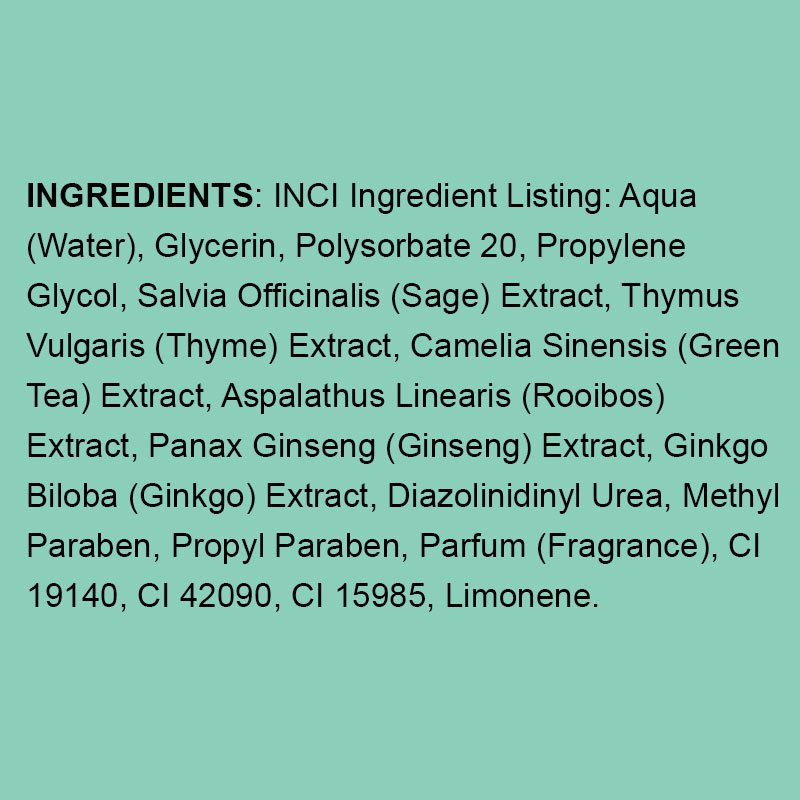 | Key Ingredients | Ginseng, Glycerin, Green Tea, Rooibos Extract, Sage Extract, Thyme |