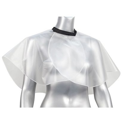 Clear PVC cape with black border. Comfortable material that provides protection and coverage during salon and beauty services.