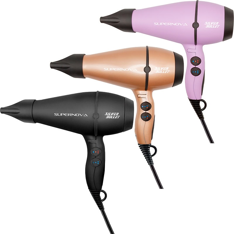 The Silver Bullet Supernova ushers in a new era of hair dryer performance for the ultimate drying experience. Designed and manufactured in Italy, including an Italian-made AC motor, the Supernova is a drying master with its incredible air pressure and heat generation. Heat is delivered to the hair so quickly for almost instantaneous drying.